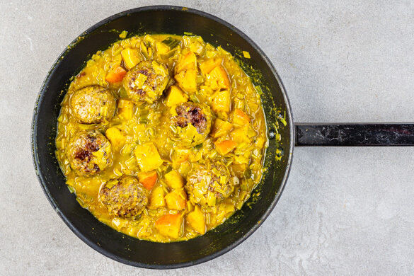 Denken wir an unseren Nachbarn im Norden, sind Rinderhackbällchen, die in Currysauce gegart werden, wohl nicht das Erste, was wir mit der dänischen Küche assoziieren. Tatsächlich sind „Boller i karry“ aber ein echter Klassiker und bei Groß und Klein beliebt. Heute wird die Sauce mit Apfelstückchen und Lauch angereichert und auf einem cremigen Kartoffelstampf mit Spinat serviert. Fantastisk, wie der Däne sagen würde.