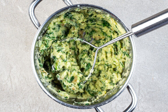 Die Kartoffeln mit dem Spinat zurück in den Topf geben, 2EL Butter und 2EL Milch hinzufügen und zu einem cremigen Püree stampfen. Das Püree mit Salz und Pfeffer abschmecken, auf tiefe Teller oder Schalen verteilen, die Hackbällchen mit der Apfel-Curry-Sauce darauf anrichten und servieren.