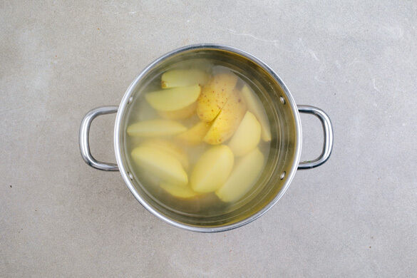 In einem mittelgroßen Topf ausreichend gesalzenes Wasser für die Kartoffeln zum Kochen bringen. Die Kartoffeln je nach Größe halbieren oder vierteln, dann ins kochende Wasser geben und in ca. 15Min. gar kochen. Den Spinat in ein Sieb geben. Die gekochten Kartoffeln in das Sieb abgießen, sodass der Spinat darunter zusammenfällt.