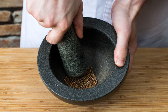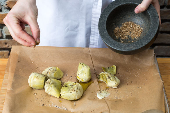 Den Backofen auf 210°C Umluft vorheizen. Die Artischocken in einem Sieb abtropfen lassen und mit Küchenpapier trocken tupfen. Die Zitronenschale abreiben, die Zitrone dann halbieren und auspressen. Den Koriandersamen in einem Mörser oder mit dem Boden einer kleinen Pfanne zerstoßen.