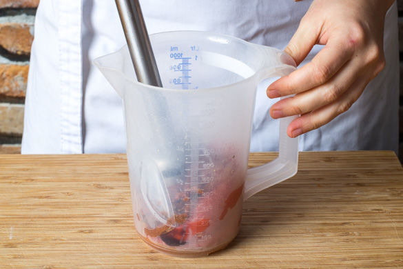 Die geröstete Paprika zusammen mit den getrockneten Tomaten in einem hohen Gefäß mithilfe eines Stabmixers fein pürieren und mit Salz und Pfeffer abschmecken. Ggf. etwas Wasser hinzufügen, falls die Sauce zu dickflüssig ist. Den Couscous mit den Artischocken anrichten, mit der Paprikasauce beträufeln und servieren.