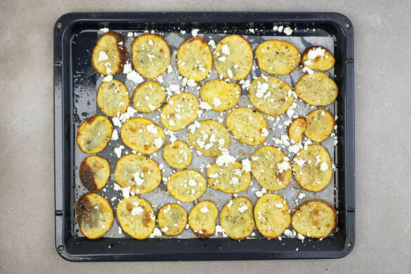 Den Feta mit den Fingern über den gebackenen Kartoffeln zerkrümeln und mit 1–2TL Oregano vermengen.