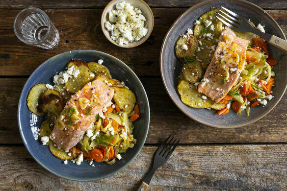 Die Kartoffeln und das Fenchel-Karotten-Gemüse auf Teller verteilen, den Lachs darauf anrichten und servieren.