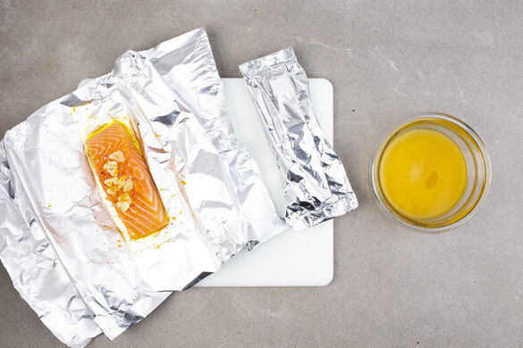 Die Orangenschale abreiben, dann die Orange halbieren und auspressen. Den Knoblauch schälen und in feine Scheibchen schneiden. Den Fisch jeweils auf ein Stück Alufolie legen. Mit insgesamt 1/2TL Olivenöl beträufeln und mit je 1 Prise Salz und Pfeffer würzen. Die Orangenschale und den Knoblauch über den Fisch streuen und die Alufolie zu luftdichten Paketen falten.