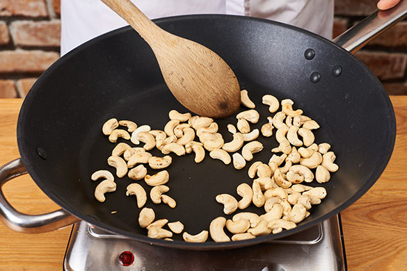 Die Cashews in einer großen Pfanne bei mittlerer Hitze ohne Zugabe von Fett ca. 2Min. leicht anrösten. Vorsicht, sie können schnell verbrennen. Aus der Pfanne nehmen und beiseitestellen.