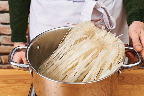 Sobald das Wasser kocht, ca. 2/3 der Nudeln hineingeben und ca. 2Min. bei niedriger Hitze köcheln lassen, vom Herd nehmen und ca. 5Min. ziehen lassen. Durch ein Sieb abgießen, mit kaltem Wasser abschrecken und abtropfen lassen. Tipp: Wer großen Hunger hat, kann einfach alle Nudeln verwenden.