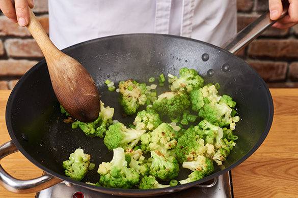 Den Romanesco in der Pfanne mit 2EL Pflanzenöl ca. 2–3Min. leicht braun anrösten. Mit 3–5EL Wasser ablöschen und abgedeckt in ca. 3–5Min. bei mittlerer Hitze bissfest garen. Wer den Romanesco etwas weicher mag, gart ihn etwas länger, evtl. muss dann noch etwas Wasser zum Dämpfen hinzugefügt werden. Die Lauchzwiebeln zugeben und ca. 1–2Min. mitgaren.