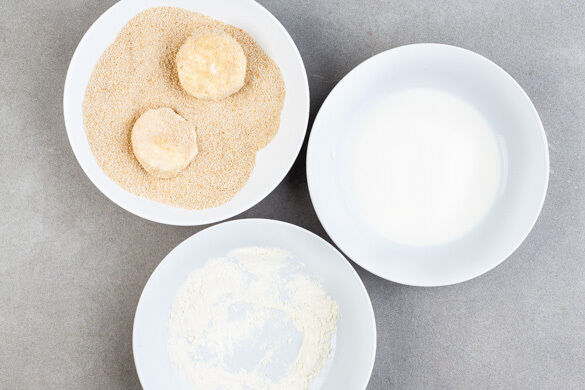 1EL Mehl auf einen tiefen Teller geben. 100ml Milch auf einen zweiten Teller gießen. Die Semmelbrösel auf einem dritten Teller bereitstellen. Die Camemberts zuerst im Mehl wenden, dann durch die Milch ziehen und anschließend in den Semmelbröseln wenden.