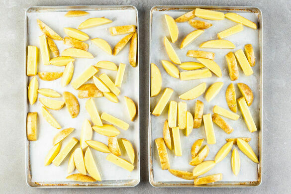 Den Ofen auf 230°C (210°C Umluft) vorheizen. Die Kartoffeln samt Schale in pommesartige Streifen schneiden und mit 1–2TL Salz und 1 kräftigen Prise Pfeffer würzen. Auf 2 mit Backpapier ausgelegten Backblechen verteilen und ca. 15Min. im Ofen backen. Dann mit je 2EL Olivenöl vermengen, die Position der Bleche tauschen und die Kartoffeln bei 250°C in ca. 15Min. goldbraun und knusprig backen.
