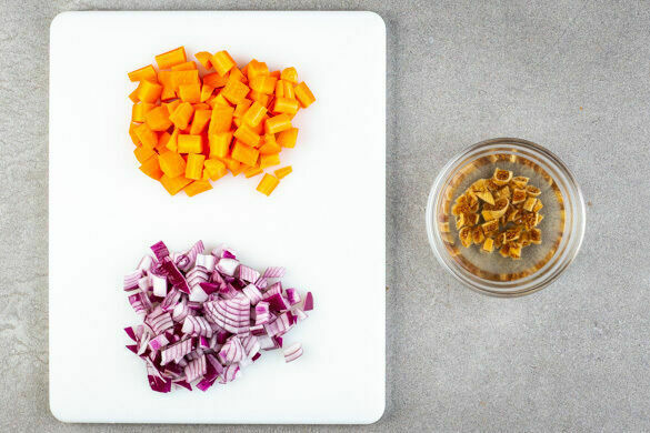 In einem großen Topf ausreichend gesalzenes Wasser für die Pasta zum Kochen bringen. Die Feigen in 150ml heißem Wasser einweichen. Die Karotten ggf. schälen, längs vierteln und in 1–2cm große Würfel schneiden. Die Zwiebel schälen, halbieren und grob würfeln.
