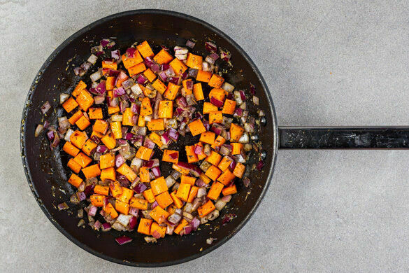 Die Zwiebeln, die Karotten, die Gewürzmischung und 1TL Salz in einer großen Pfanne mit 2EL Olivenöl bei mittlerer Hitze 4–5Min. anbraten, dabei gelegentlich umrühren.