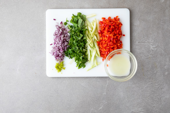 Die Paprika vierteln, entkernen und in kleine Würfel schneiden. Den Stangensellerie längs halbieren und schräg in dünne Scheiben schneiden. Die Minzeblätter abzupfen und mit dem Koriander und der Petersilie samt Stängeln grob schneiden. Die Zwiebel schälen, halbieren und fein würfeln. Die Limettenschale abreiben, dann die Limette halbieren und auspressen.