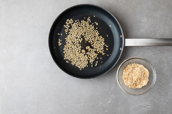 Die Sonnenblumenkerne in einer mittelgroßen Pfanne bei mittlerer Hitze ohne Zugabe von Fett 1–2Min. goldbraun anrösten. Vorsicht, sie können schnell zu dunkel werden. Zum Abkühlen aus der Pfanne nehmen und beiseitestellen. In derselben Pfanne die Kokosraspeln ebenfalls ohne Zugabe von Fett 1–2Min. anrösten und anschließend beiseitestellen.