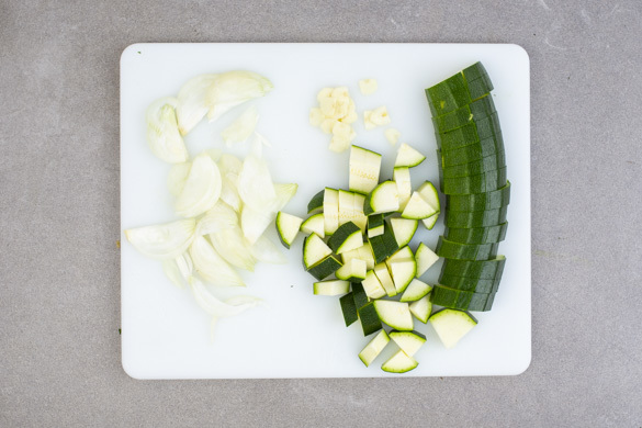 Den Backofen auf 220°C (200°C Umluft) vorheizen. Die Zucchini längs vierteln und in ca. 1cm kleine Stücke schneiden. Die Zwiebel schälen, halbieren und in feine Streifen schneiden. Den Knoblauch schälen, halbieren und in feine Scheibchen schneiden.