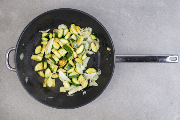 Die Zucchini in einer großen Pfanne mit 1–2EL Olivenöl bei starker Hitze ca. 2Min. anbraten.