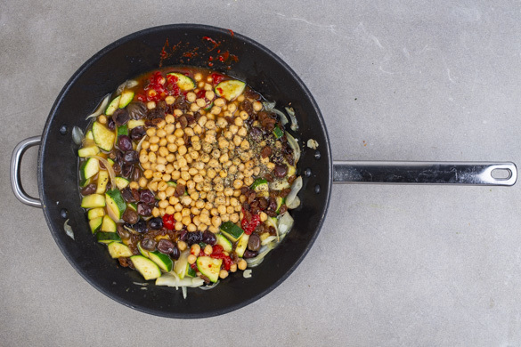 Das Tomatenmark unterrühren und mit den Kichererbsen samt Flüssigkeit ablöschen. Die Worcestershiresauce, die Oliven und die Rosinen dazugeben und alles einmal aufkochen lassen. Mit den restlichen Provence-Kräutern, Salz und Pfeffer abschmecken.
