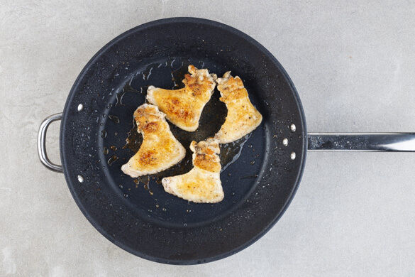 Das Fleisch in einer großen Pfanne bei mittlerer Hitze auf jeder Seite 3–4Min. goldbraun anbraten. Bei Bedarf ggf. 1EL Olivenöl während des Bratens hinzugeben.