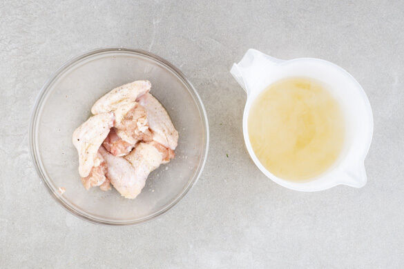 Das Fleisch trocken tupfen. 2EL Olivenöl mit 2 Prisen Salz und Pfeffer verrühren und mit dem Fleisch vermengen. Das Brühgewürz in 200ml heißem Wasser auflösen.