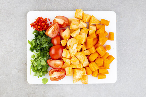 Die Süßkartoffeln schälen und in ca. 2cm große Würfel schneiden. Die Karotten ggf. schälen und ebenfalls in ca. 2cm große Würfel schneiden. Die Tomaten vierteln. Den Koriander und die Petersilie samt Stängeln fein schneiden. Die Peperoni längs halbieren, entkernen und in feine Streifen schneiden.