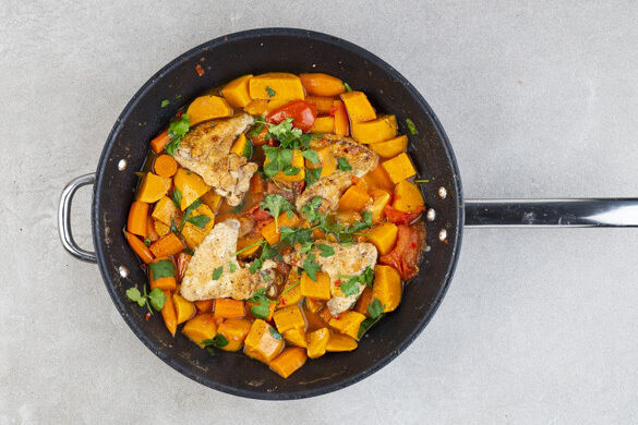 Die Gewürzmischung über dem Gemüse verteilen, dann die Brühe angießen und einmal aufkochen lassen. Das Fleisch und das Gemüse anschließend abgedeckt bei mittlerer Hitze 25–30Min. gar köcheln lassen.