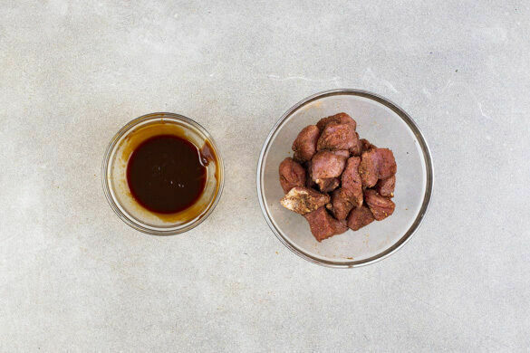Den Backofen auf 220°C (200°C Umluft) vorheizen. Das Fleisch trocken tupfen, in mundgerechte Stücke schneiden und mit der Gewürzmischung einreiben. Die Hoisinsauce mit 4EL Wasser verrühren.