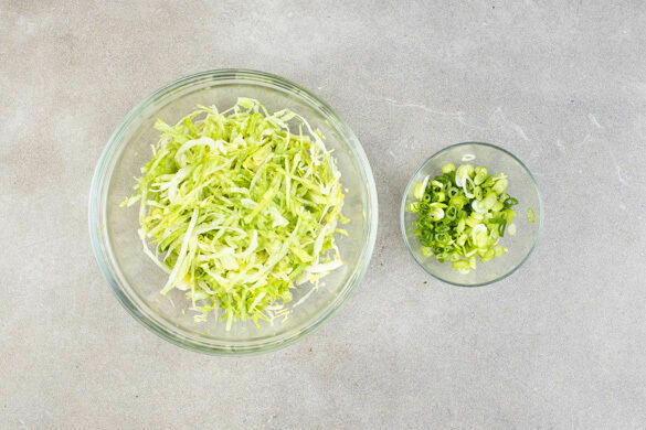 Den Salat halbieren und in dünne Streifen schneiden. Die Lauchzwiebeln in dünne Ringe schneiden.