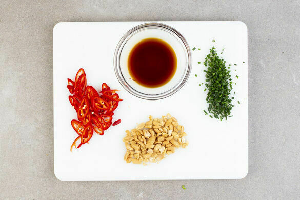 Die Sojasauce mit 2EL hellem Essig, 2EL Wasser und 1EL Honig oder Zucker zu einem Dressing verrühren. Die Erdnüsse grob hacken. Den Schnittknoblauch und die Peperoni in feine Ringe schneiden.