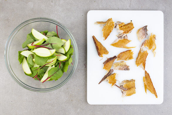 Chioggia-Bete schmeckt nicht nur extrem lecker, sie sieht mit ihrer rot-weißen Maserung auch wunderschön aus! Die erdigen Prachtstücke gibt es heute als Teil eines knackigen Salats mit Apfel und Kartoffeln, der mit einer Joghurt-Meerrettich-Creme verfeinert wird. Obendrauf spendieren wir geräuchertes Makrelenfilet, für weitere Farb- und Geschmacksakzente sorgen aromatischer Dill und frische Frühlingszwiebeln. Ahoi!