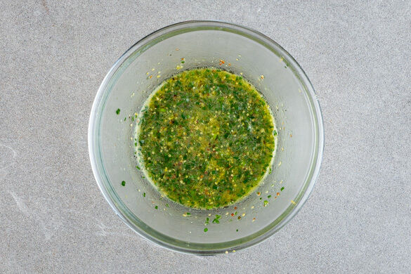 Die Zitronenschale abreiben, dann die Zitrone halbieren und eine Hälfte auspressen. Die übrige Hälfte wird für dieses Rezept nicht benötigt. Den Schnittlauch in feine Röllchen schneiden, dann mit dem Zitronensaft, 1/2TL Zitronenschale, 1TL Senf sowie je 1 Prise Salz und Pfeffer verrühren. Langsam 2EL Olivenöl unterrühren und alles gut vermengen.