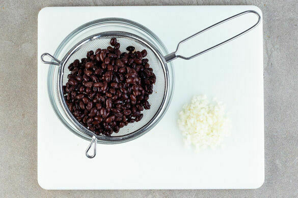 Den Backofen auf 220°C (200°C Umluft) vorheizen. Die Bohnen in einem Sieb abtropfen lassen. Die Zwiebel schälen, halbieren und fein würfeln.