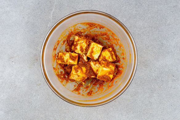 In einem mittelgroßen Topf 600ml leicht gesalzenes Wasser für den Reis zum Kochen bringen. Den Tofu in mundgerechte Würfel schneiden und mit 1–2TL Pflanzenöl sowie 1/3 der Currypaste vermengen. Bis zur weiteren Verwendung beiseitestellen.
