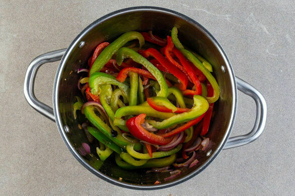 Die Zwiebeln im selben Topf mit 2EL Olivenöl bei mittlerer Hitze 2–3Min. goldbraun anbraten. Die Paprika und den Knoblauch dazugeben und 1–2Min. mitbraten.