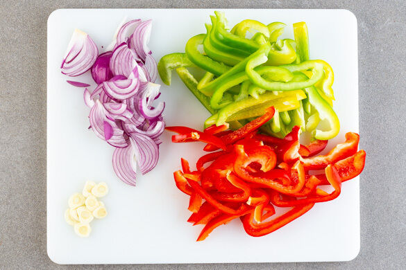 Die Paprika vierteln, entkernen und in dünne Streifen schneiden. Die Zwiebel schälen, halbieren und in feine Streifen schneiden. Den Knoblauch schälen und in feine Scheibchen schneiden.