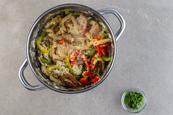 Heute machen wir One-Pot-Pasta! Nein, Moment ... Fajitas! Nein, Moment ... Ach, ist ja auch egal, jedenfalls geht’s superfix und wird richtig lecker – und auch der in Rekordzeit abgewickelte Abwasch wird sich sehen lassen können, denn wir brauchen nur einen einzigen Topf! Du willst Details? Na gut: Es gibt zartes Hähnchen und bunte Paprika in käsig-knoblauchiger Sauce mit frischem Koriander. Probieren musst du nun aber selbst!