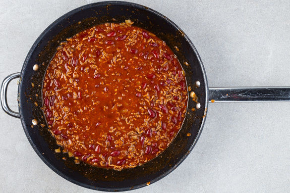 Das Hackfleisch in einer mittelgroßen Pfanne mit 1EL Olivenöl bei mittlerer bis starker Hitze ca. 3Min. krümelig anbraten. Die Zwiebeln und den Knoblauch 2Min. mitbraten, dann die Gewürzmischung und das Tomatenmark einrühren. Die Bohnen samt Flüssigkeit, 150ml Wasser und das Brühgewürz unterrühren und alles 8–10Min. köcheln lassen. Mit Salz und Pfeffer abschmecken.