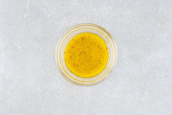 Je 1EL Olivenöl, Essig und Wasser mit dem 1TL Senf, 1/2TL Honig oder 1–2 Prisen Zucker sowie je 1 Prise Salz und Pfeffer zu einem Dressing verrühren.