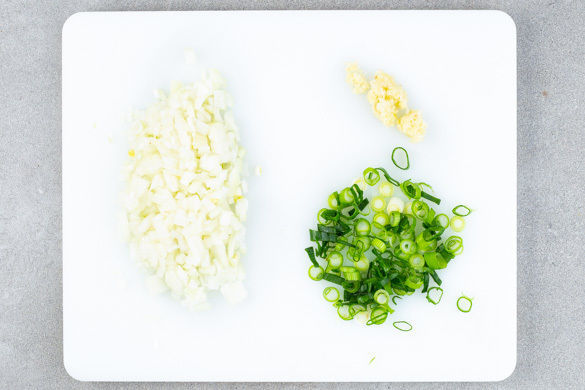Den Backofen auf 240°C (220°C Umluft) vorheizen. Die Lauchzwiebel in feine Ringe schneiden. Die Zwiebel schälen, halbieren und in kleine Würfel schneiden. Den Knoblauch schälen und ebenfalls fein würfeln.
