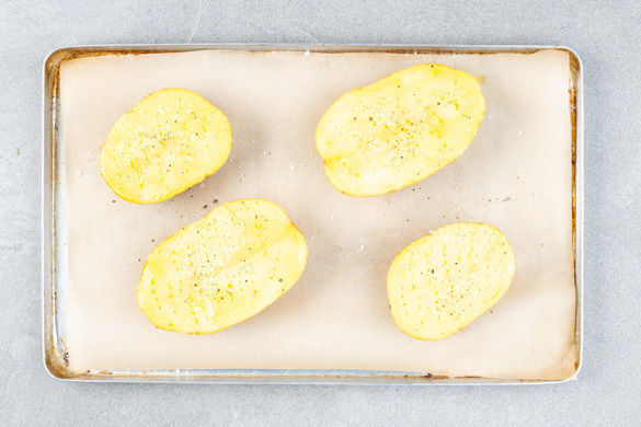 Die Kartoffeln längs halbieren und die Schale mehrmals mit einer Gabel einstechen. Die Kartoffeln mit 1EL Olivenöl sowie je 1 Prise Salz und Pfeffer vermengen und auf einem mit Backpapier ausgelegten Backblech 30–35Min. im Ofen backen, bis die Kartoffeln gar sind.