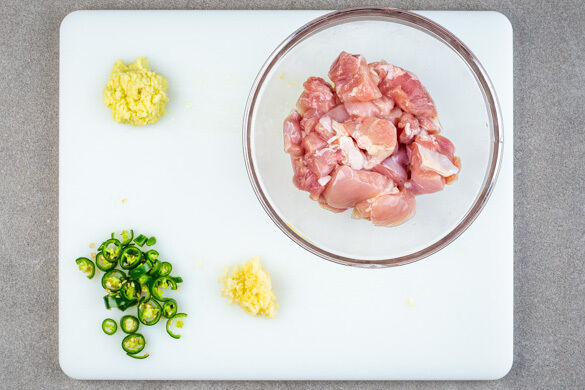 Die Peperoni in feine Ringe schneiden. Tipp: Für weniger Schärfe die Kerne entfernen. Den Knoblauch schälen und sehr fein würfeln oder durch eine Knoblauchpresse drücken. Den Ingwer schälen und fein reiben. Das Fleisch trocken tupfen und in ca. 2cm große Stücke schneiden.