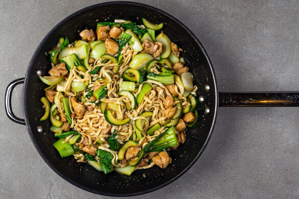 Hähnchen-Nudelpfanne Naxi-Art mit Gurke, Pak Choi und Erdnüssen
