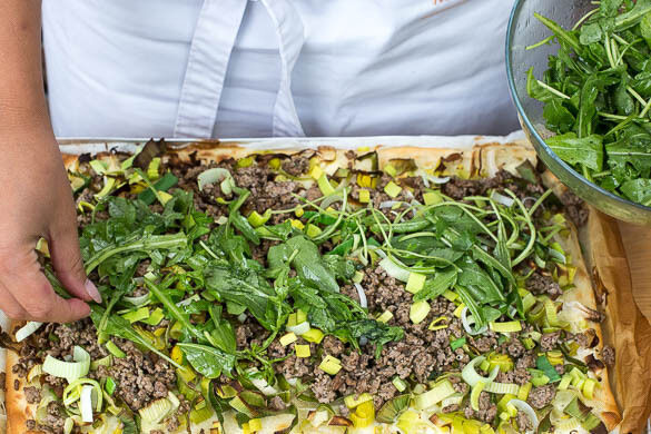Eine köstlich-knusprige Tarte ist einfach unwiderstehlich! Heute braten wir dafür saftiges Rinderhackfleisch, das mit Crème fraîche und Lauch den deftigen Belag auf dem feinen Flammkuchenteig bildet. Dazu ein knackiger Rucolasalat und alles ist gut!