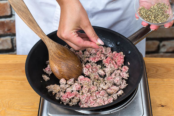 Den Backofen auf 220°C (200°C Umluft) vorheizen. Das Hackfleisch in einer mittelgroßen Pfanne mit 1EL Olivenöl bei starker Hitze 2–3Min. anbraten, dann mit dem Bratkartoffelgewürz sowie Salz und Pfeffer abschmecken.