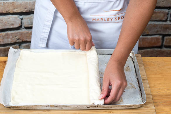 Nebenher den Teig mit dem Papier nach unten auf einem Backblech ausrollen.