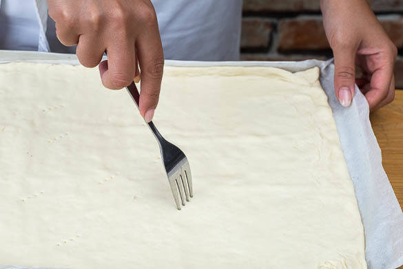 Mit einer Gabel Löcher in den Teig stechen und den Teig 3–4Min. im Ofen vorbacken, bis er leicht zu bräunen beginnt.