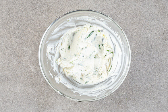 Den Ziegenfrischkäse mit dem Knoblauch, ca. 3/4 des Estragons und 1/2TL Pfeffer verrühren.