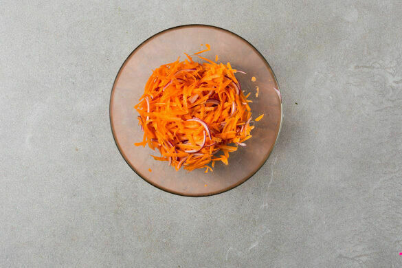 Die Karotten ggf. schälen und grob raspeln. Die Zwiebel schälen, halbieren und in dünne Streifen schneiden. Tipp: Wer keine rohen Zwiebeln mag, kann die Zwiebelstreifen vor der weiteren Verwendung 5Min. in heißem Wasser einweichen.