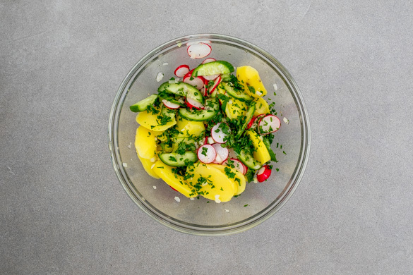 Die Kartoffeln und die Petersilie vorsichtig unter die Gurken und die Radieschen heben. Den Salat vorsichtig mit 3EL Pflanzenöl vermengen und mit 2EL Essig sowie Salz und Pfeffer nach Geschmack würzen. Die Hähnchenschenkel mit dem lauwarmen Kartoffelsalat anrichten und servieren.