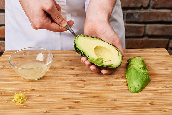 Inzwischen die Avocado mit einem Messer halbieren und mit einem Löffel vorsichtig aus der Schale lösen. Avocado in Scheiben schneiden und auf einen Teller geben. Die Schale der Zitrone abreiben und den Saft auspressen. Die Avocado mit 1-2EL Zitronensaft marinieren.