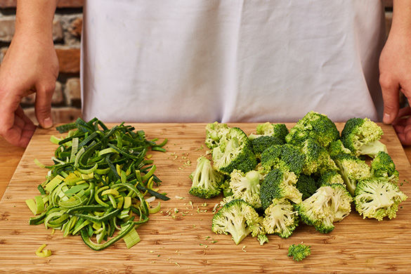 In einem großen Topf ausreichend leicht gesalzenes Wasser zum Kochen bringen. Den Lauch der Länge nach halbieren, gründlich waschen und in feine Streifen schneiden. Den Brokkoli vom Strunk befreien und in mundgerechte Röschen schneiden.