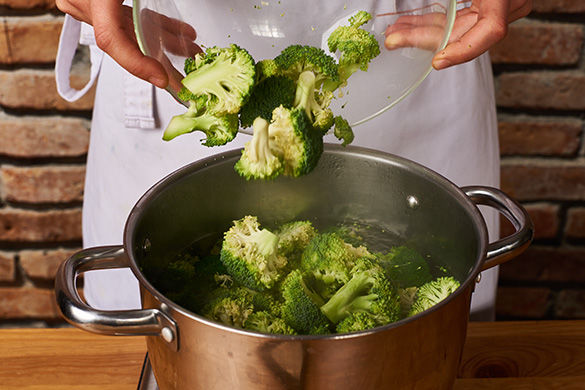 Den Brokkoli ins kochende Wasser geben und ca. 4–5Min. je nach Wunsch weich oder knackig garen. Mit einer Schaumkelle aus dem Topf nehmen und in einem Sieb mit kaltem Wasser abschrecken und abtropfen lassen. Das Wasser erneut aufkochen.